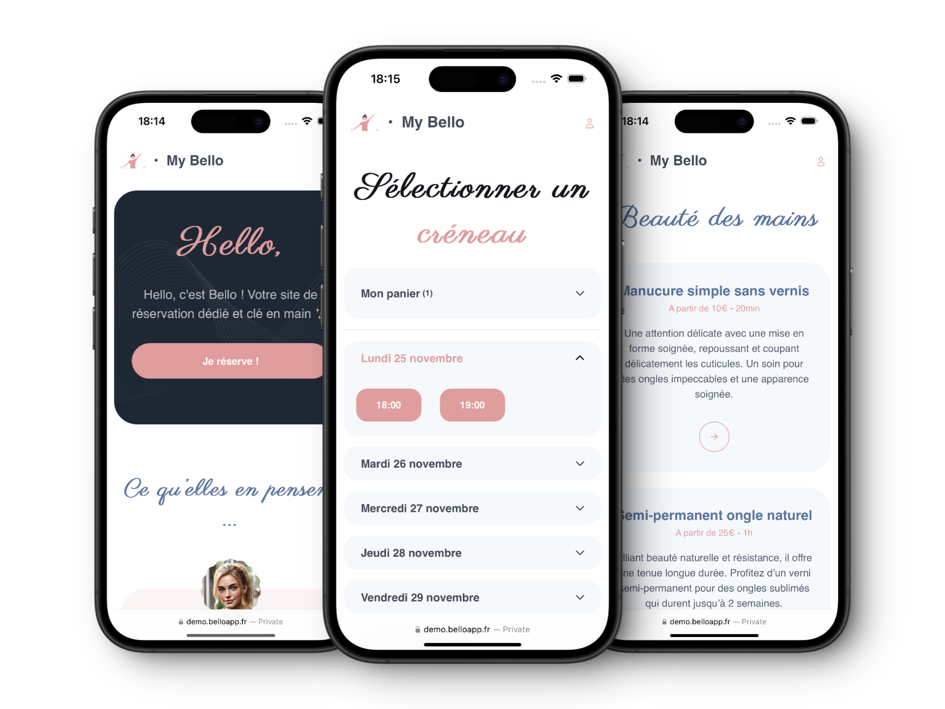 Mes clientes apprécient la facilité de prise de rendez-vous, ce qui a boosté les réservations. Bello donne une image professionnelle et offre un suivi clair du chiffre d’affaires. Je recommande à 100% !"